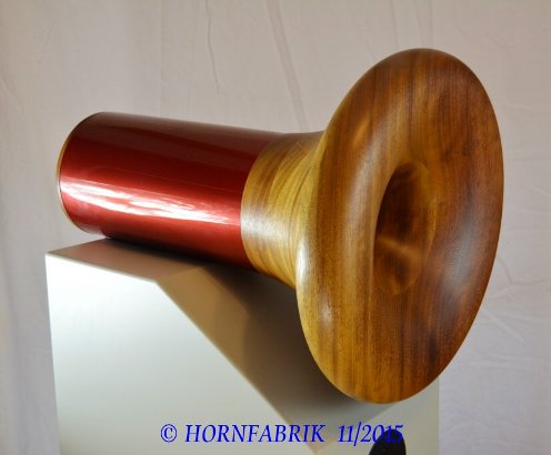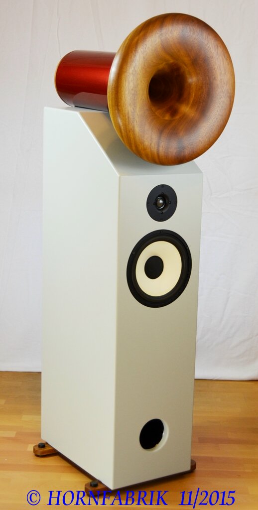 Der Hornlautsprecher Famulus wird seit vielen Jahren als Bausatz mit zwei 6,5“-Bässen in Baßreflexanwendung angeboten. Dadurch kann die Gehäusegröße moderat gehalten werden. Dieser Ansatz wurde auch beim Hornlautsprecher Famulus II mit einem 10“-Baß beibehalten. Dadurch erreicht man einen Wirkungsgrad von 93 dB/W/m und kann im Superhochtonbereich eine Kalotte mit Hornansatz verwenden, so dass dieser Lautsprecher auch auf kürzeste Hörentfernung und damit in kleinsten Räumen verwendet werden kann – auch als Monitor. Die Klangbalance bleibt auch bei geringsten Lautstärken erhalten. Größere Räume füllt der Hornlautsprecher bei diesem Wirkungsgrad selbstredend. Er kann auch richtig laut spielen. Das treibergeladene Vollholzhorn im Mitteltonbereich sorgt mit dem schlichten Gehäuse für eine zeitlose Optik mit dem souveränen Klang unserer Holzhörner mit der wellenoptimierten Kontur der Hornfabrik. Die Holzart kann frei gewählt werden, allerdings sind wir darauf angewiesen, möglichst lange gelagertes Holz zur Verfügung zu haben. Gesamthöhe: 155 cm |