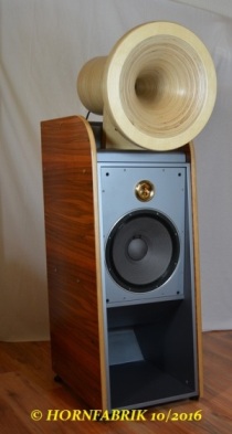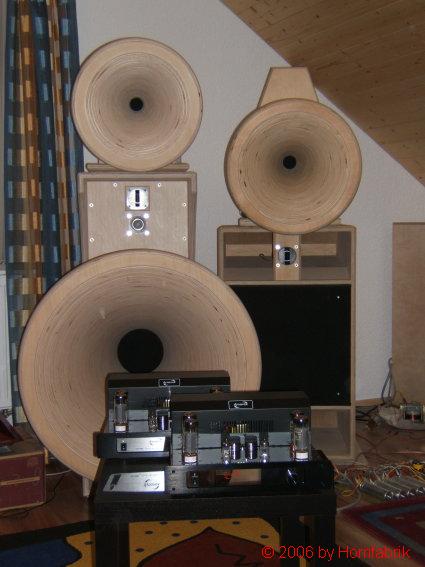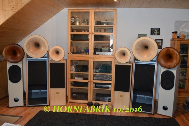 Der Schwerpunkt sind selbstredend unsere Hornlautsprecher. Insbesondere  die wellenoptimierten Holzhörner mit einem Durchmesser von bis zu 130 cm bilden das Rückgrat für einen natürlichen, dynamischen und schon ein bisschen explosiven Klang. Dazu verwenden wir ausgesuchte Bauteile und verfügen über einen guten Fundus der legendären Hersteller.